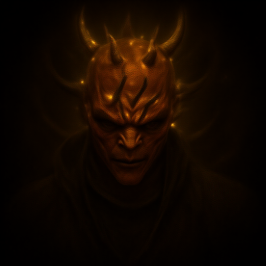 Symmetrical portrait of Darth Maul in gold and black, Star Wars, sci-fi theme, with glowing lights; intricate, elegant, and highly detailed, resembling a photograph; artstation quality, with a touch of dark mystique and vibrant highlights.