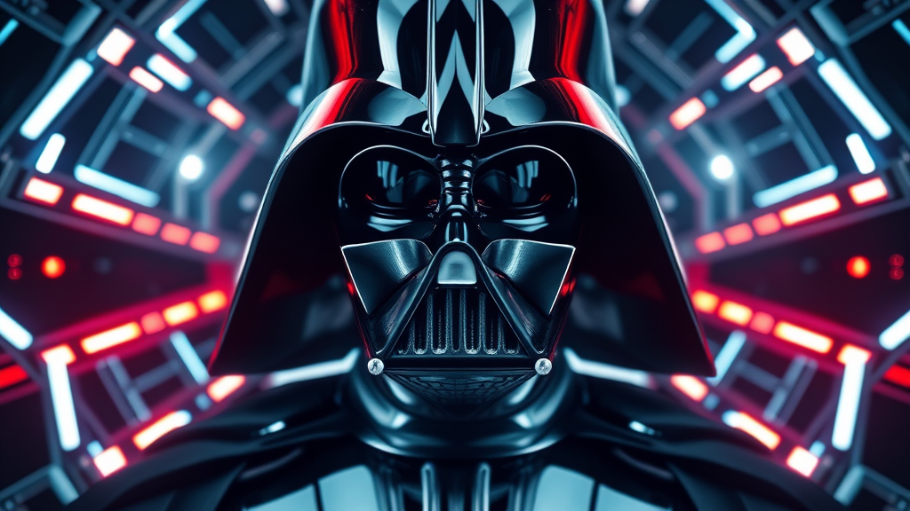 Symmetrical portrait of Darth Vader from Star Wars in a sci-fi setting, featuring glowing lights and an intricate, elegant design. The composition is highly detailed and photographed with an artstation-quality aesthetic. Include subtle creative variations while preserving the core elements of iconic sci-fi imagery and visually striking symmetry.