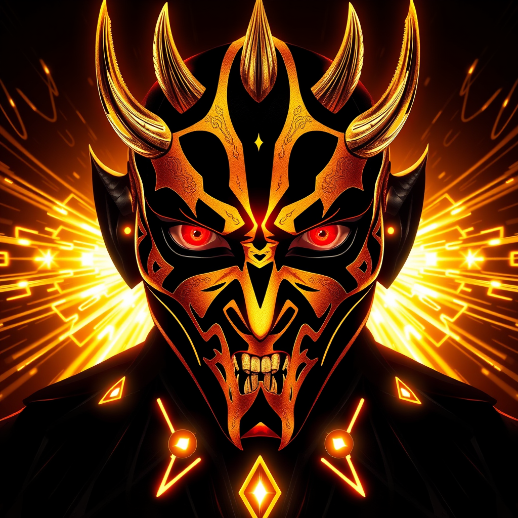 Symmetrical portrait of gold and black Darth Maul from Star Wars, sci-fi theme, incorporating glowing lights and intricate elegance, highly detailed, photographic quality, inspired by artstation style.