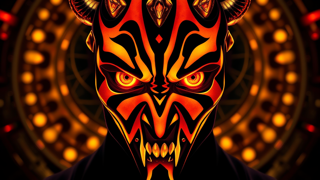 Symmetrical portrait of golden and black Darth Maul, Star Wars universe, sci-fi setting, illuminated with glowing lights, intricate and elegant, highly detailed photograph, inspired by high-quality artstation aesthetics, with subtle creative twists enhancing the character's intense and enigmatic presence.