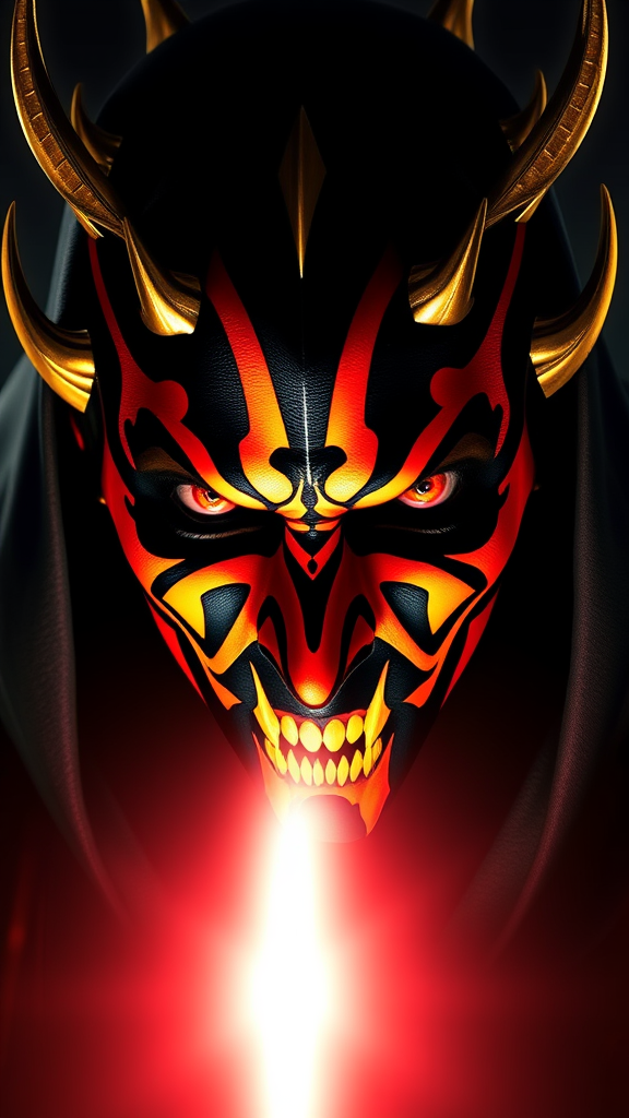 Symmetry in a portrait of Darth Maul, featuring hues of gold and black, set in a Star Wars sci-fi universe with glowing lights; an intricate, elegant depiction with high detail, reminiscent of a photograph on ArtStation, with subtle creative twists enhancing its allure.