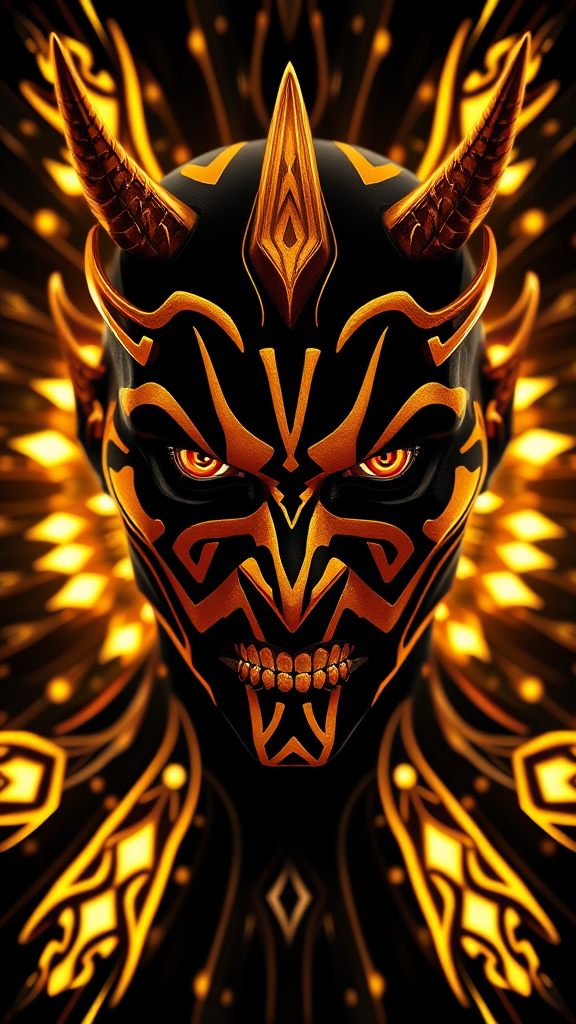 Symmetry inspired portrait of a mesmerizing black and gold Darth Maul, Star Wars, sci-fi, radiant lights, intricate, elegant, and highly detailed photograph, artstation.