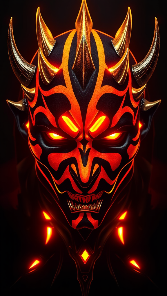 Symmetry-inspired portrait of Darth Maul in gold and black, embodying a sci-fi essence with glowing lights. Intricate, elegant, and highly detailed, reminiscent of a photograph, capturing the essence of artstation’s quality with a touch of creative flair.