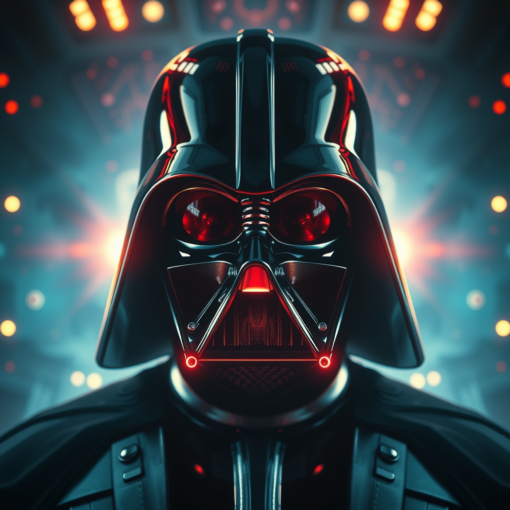 Symmetry-inspired portrait of Darth Vader from Star Wars, set in a sci-fi realm with glowing lights. The image is intricate, elegant, and highly detailed, resembling a photograph suitable for an ArtStation gallery. With creative modifications, the scene captures the iconic helmet reflecting symmetrical light patterns, enhancing the aura of mystery and power, enveloped in an ethereal glow that highlights the detailed textures and contours of Vader's visage.