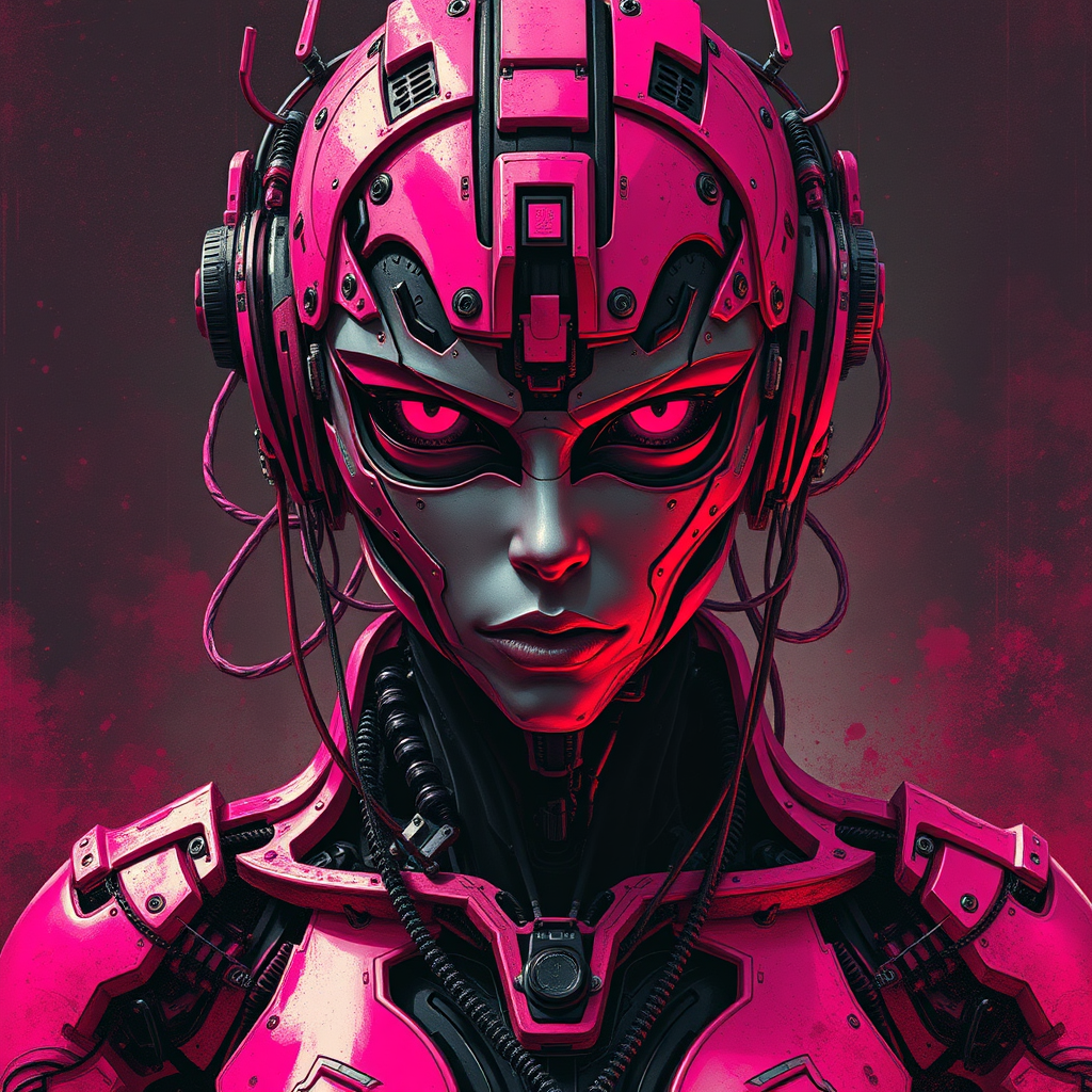 Synthetic mechanic visage with artistic upper-body, intricate and detailed features, piercing gaze set in a dystopian and cold atmosphere; limited palette dominated by deep hot pink intertwined with stark black. Inspired by Tsutomu Nihei, this creation echoes a raw, complex aesthetic with chaotic undertones. The scene is elongated in composition, merging futuristic tension with a stylized intensity.