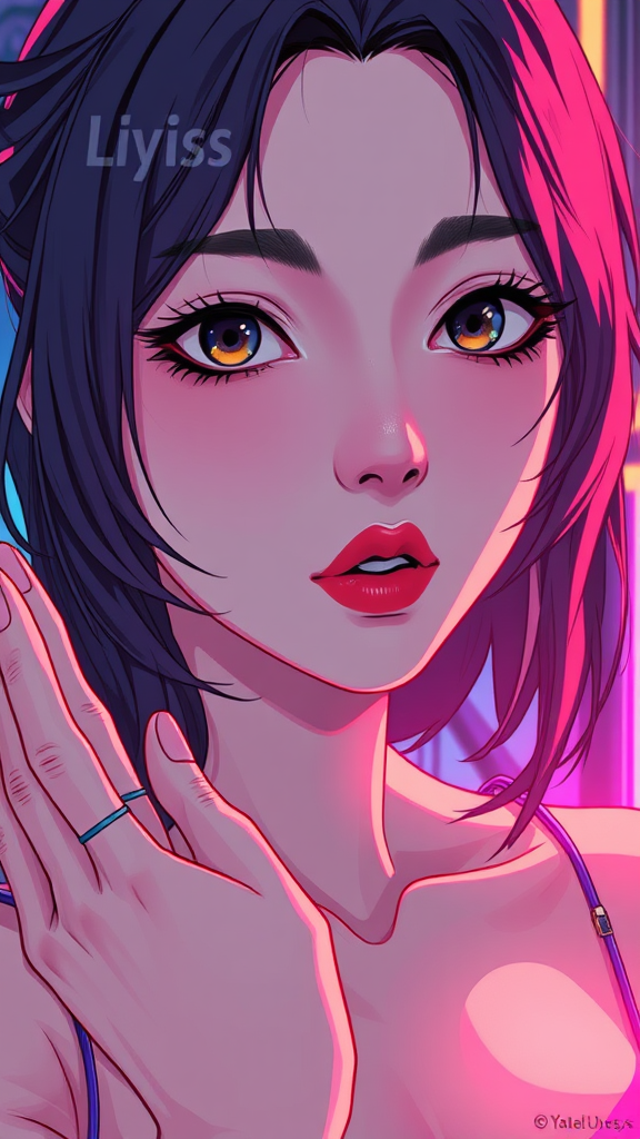 Synthwave-inspired portrait of an anime-style woman featuring a fusion of Ghibli and Akihiko Yoshida aesthetics. Envision her within a vivid cyberpunk and sci-fi setting, illuminated by soft, ambient light. Her face is meticulously detailed, embodying elegance and perfection in art. However, there are intentional imperfections: low resolution, text distortions, missing and extra fingers, and cropped framing contribute to the scene. Lower quality elements such as jpeg artifacts, unclear anatomy, and extraneous or missing limbs are present. Hands and feet may appear poorly drawn. The composition may include disfigurements, out-of-frame elements, and tiling. Artistic defects such as deformations and mutations create a sense of blurriness, fuzziness, and distortion. The work includes aspects that deviate from traditional beauty, incorporating details that could seem gross, unattractive, or disfigured, with possible watermarks present.
