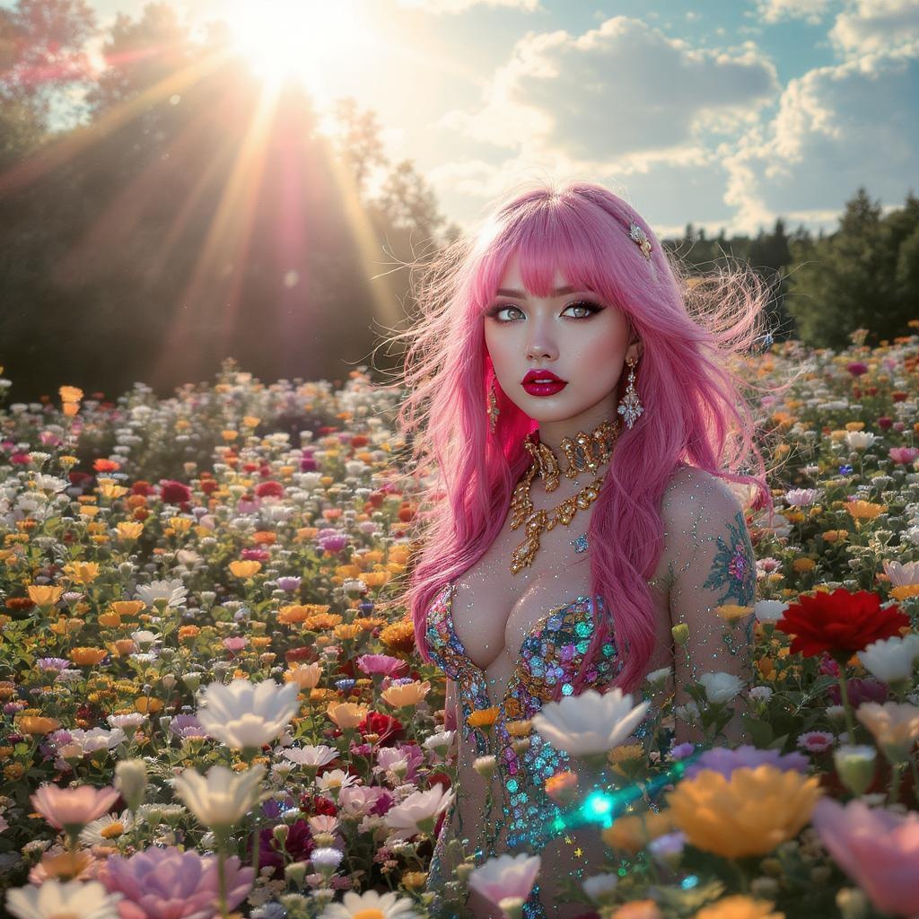 Synthwave-inspired scene featuring a Russian model with vibrant pink hair, standing amidst a meadow brimming with diverse, beautiful flowers. The sun casts dazzling light in the lens of a macro camera, creating a mesmerizing tapestry of complex glitters. Embrace insane levels of detail, with each element hyperdetailed and intricately crafted. Emulate the artistic style of Ivan Fomin, Anton Zemskov, and Mike Sass, capturing a realistic yet imaginative depiction. Aim for an 8k resolution, echoing the refined aesthetics of Stanley Artgerm, Tom Bagshaw, Greg Rutkowski, Carne Griffiths, Ayami Kojima, and WLOP. The scene boasts a sharp cinematic focus with glowing magical lens flares, blending fantasy with realism. The vibrant surroundings are painted with rich, vivid colors under ambient lighting, offering an epic illustration akin to anime key visuals and concept art.