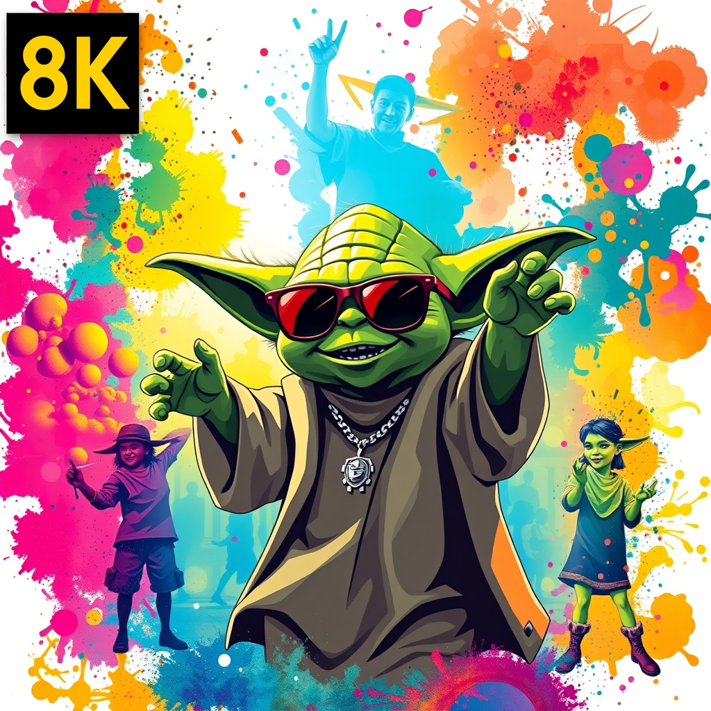 T-shirt design featuring a vibrant, colorful ink splash background showcasing Yoda in stylish sunglasses, joyfully dancing at a lively festival scene, rendered in stunning 8k detail with playful elements and energetic movement.
