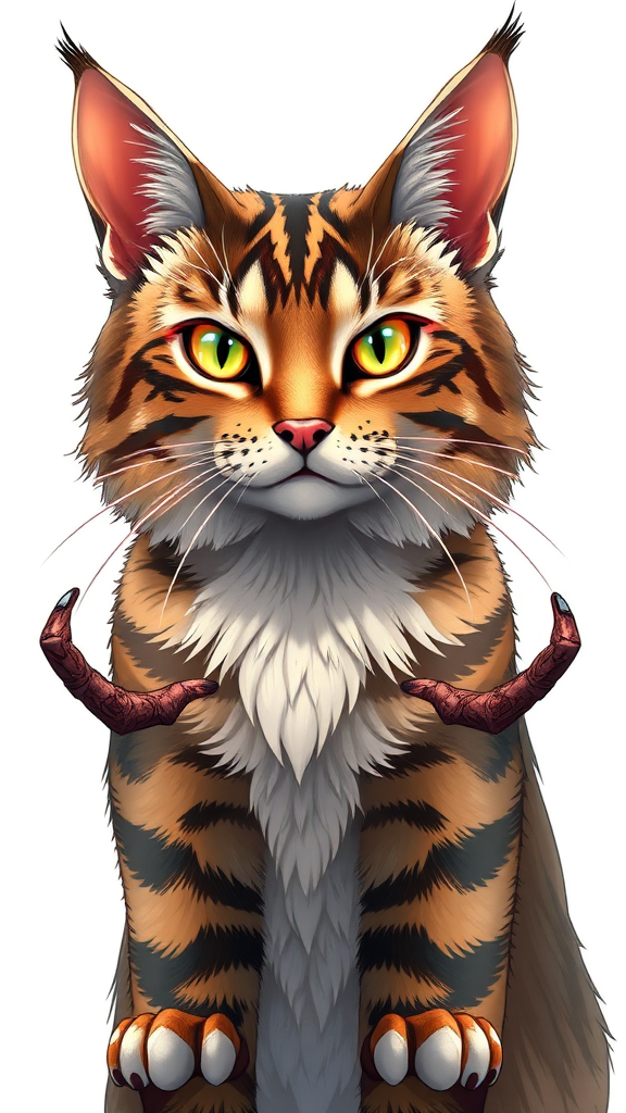 Tabby cat animal, anime-inspired, ultra-detailed, feline eyes, majestic, noble, grand, stark white background, fantasy theme, HD design reminiscent of Makoto Shinkai's style, influenced by Granblue Fantasy, glowing effects, 8k resolution, UHD with HDR quality, rendered with Model: Maplesyrup v10, duplication elements, unique mutations for creative flair, artistic clone effect, slightly cross-eyed for whimsy, elongated elegant neck, additional fingers for an imaginative touch, detailed mutated hands adding character, avoiding low resolution, ensuring everything is in-frame with clear focus, free from blurry visuals, jpeg artifacts, watermarks, logos, letters, usernames, and words, presented without being cropped or resembling a split image.