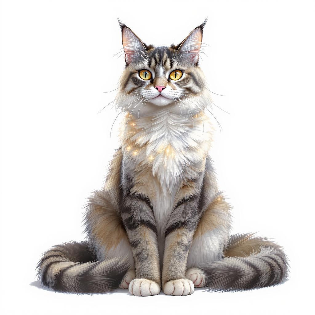 Tabby cat animal, anime style, ultra-detailed, enchanting feline eyes, majestic, noble, grand presence, pristine white background, fantasy aura, high-definition design inspired by Makoto Shinkai, reminiscent of Granblue Fantasy, subtle glow effects, 8k resolution, UHD, HDR, crafted with a touch of Maplesyrup v10. Characterized by a cloned face with cross-eyed expression, elongated neck, and extra digits. Imagery subtly altered to ensure high clarity and quality, avoiding low resolution, blur, jpeg artifacts, watermarks, logos, text overlays, or cropping. Artistry akin to a fantasy postcard, preserving both detail and imagination.