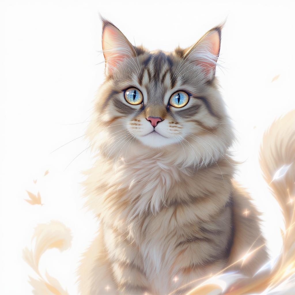 Tabby cat anime style featuring ultra-detailed feline eyes with a majestic and noble presence on a white background, inspired by fantasy elements and HD design similar to Makoto Shinkai and Granblue Fantasy. The scene includes glow effects, crafted in 8k UHD and HDR design. The cat is presented with an elegant pose, avoiding any mutations or cloning effects, ensuring symmetry and clarity. The focus is on capturing the beauty and grace of the feline without any distractions like low resolution or out-of-frame issues.