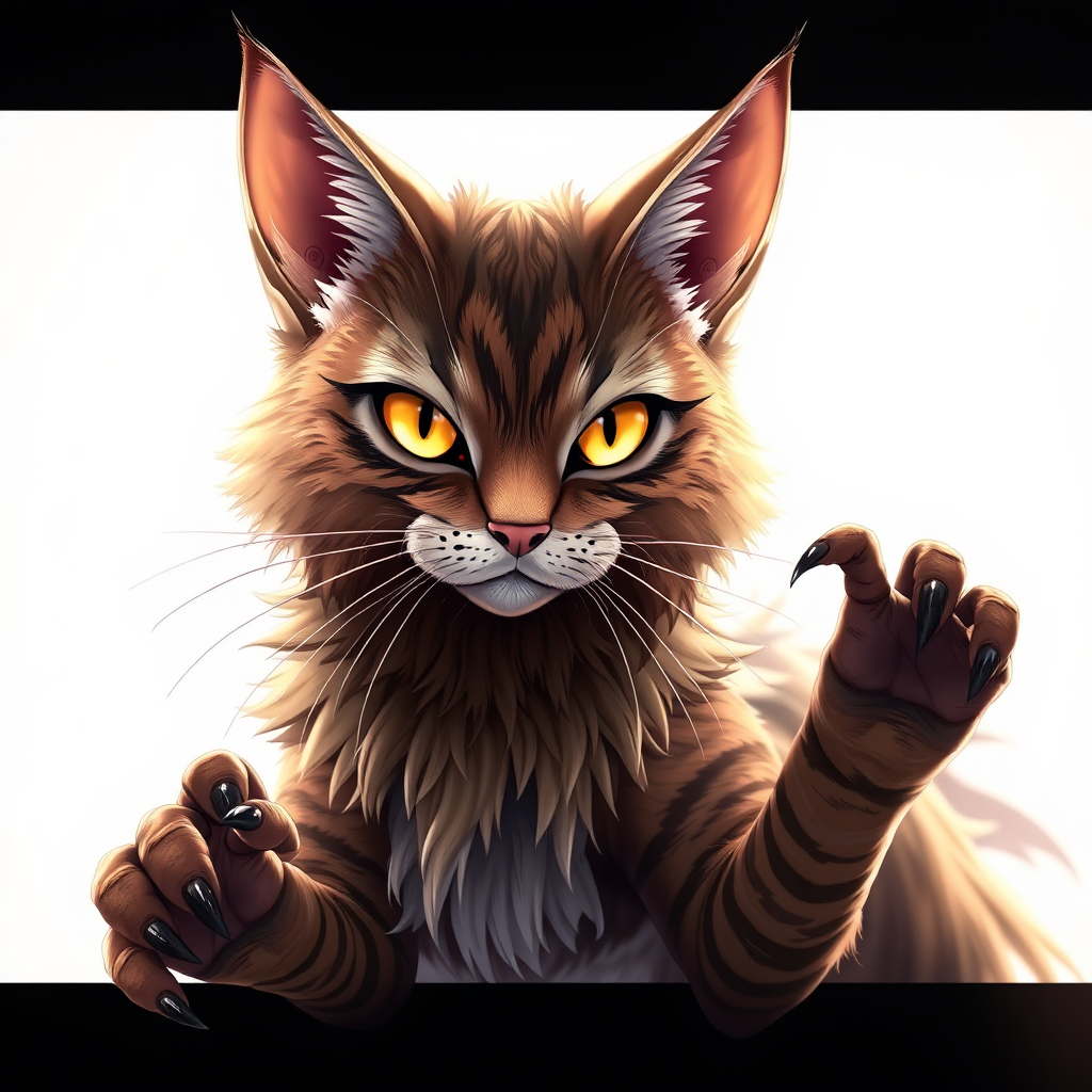 Tabby cat creature, anime-inspired, highly detailed, feline gaze, majestic, noble, grand essence, set against a pristine white backdrop, fantasy-themed, HD artistry by Makoto Shinkai, Granblue Fantasy influences, luminous effects, rendered in 8k, UHD, HDR quality, interpreted through Model: Maplesyrup v10, with unique enhancements, artistic mutations, subtly transformed, with a hint of cross-eyed intrigue, elongated neck, additional fingers, creatively distorted hands, refined details, in-frame focus, sharp resolution, absence of jpeg artifacts, no visible watermarks, devoid of logos, text, or cropped, maintaining a cohesive animation style.