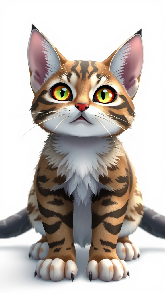 Tabby cat creature, anime-inspired, hyper-detailed, feline gaze, majestic and noble presence, grand demeanor, set against a pristine white backdrop, fantasy theme, high-definition design reminiscent of Makoto Shinkai’s style, Granblue Fantasy influence, luminous effects, captured in 8k resolution, engaging UHD quality, HDR visuals, enhanced model inspiration, duplication elements, slight mutations and creative irregularities, gentle cross-eyed charm, gracefully extended neck, quirky extra limbs, whimsically altered paws, focused composition, sharp clarity, without distortions or added text, maintaining a sense of fantasy animation realism.