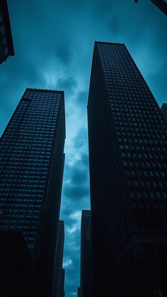 Tall skyscrapers dominate a darkened sky, their structures captured in sharp perspective angles reminiscent of the American Barbizon School. The scene is painted in hues of soft maroon and sky blue, evoking an atmosphere of raw street photography. Drawing inspiration from Asher Brown Durand, the image conveys an intricate and high-resolution depiction, embodying the essence of yankeecore. The composition maintains a raw aesthetic with a vertical aspect ratio, preserving its artistic finesse and structured depth.