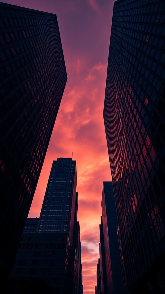 Tall skyscrapers loom against a dusky sky, captured through sharp perspective angles reminiscent of the American Barbizon School. The scene is bathed in hues of light maroon and sky-blue, echoing the essence of raw street photography. Inspired by the works of Asher Brown Durand, the composition exudes a 32k UHD clarity with a touch of Yankeecore style. The raw aesthetic provides a gritty, real-world vibe, with towering structures creating dramatic silhouettes against the vast sky, all within the constraints of a tall and narrow frame.