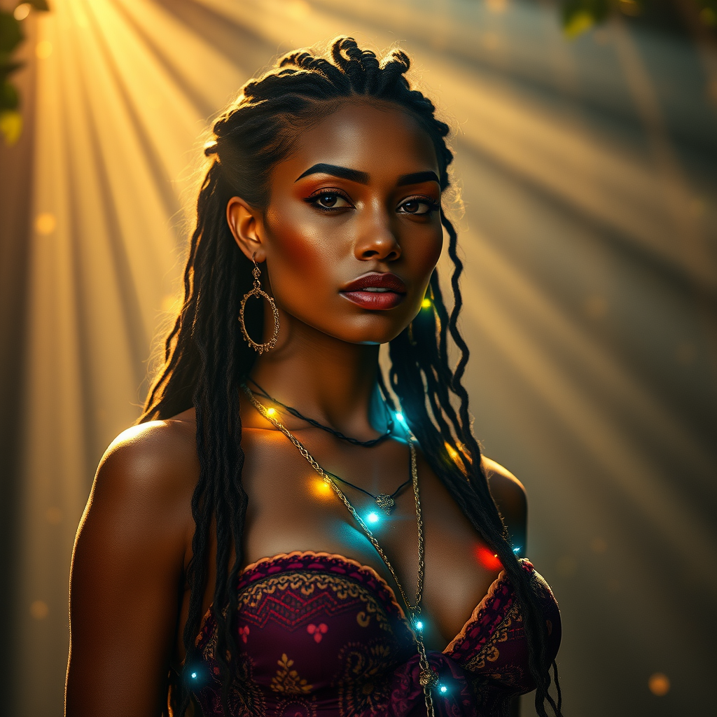 Tall, striking woman of Amazonian descent, intricately detailed, surrounded by ethereal fairy lights that cast soft, photorealistic glows, vibrant and vivid colors fill the scene, with dramatic volumetric rays of sunlight streaming through, creating a high dynamic range of light and shadow, set in an elongated portrait aspect ratio of 9:16.