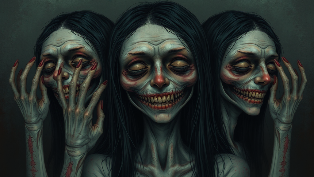 tanya shatseva-inspired, dark atmosphere, psychopathic undertones, gloomy essence, madness, low resolution, jpeg distortions, unattractive, repeating elements, morbid themes, mutilation hints, poorly illustrated hands and face, mutated, deformed characters, blurred lines, desolate, incorrect anatomy, disproportionate features, surplus or missing limbs, cloned expressions, distorted proportions, malformed extremities, elongated necks, visual noise, extraneous watermarks or signatures, awkwardly cropped images, censored elements, flawed bodily depictions, unsettling smiles, and obscure deformities.