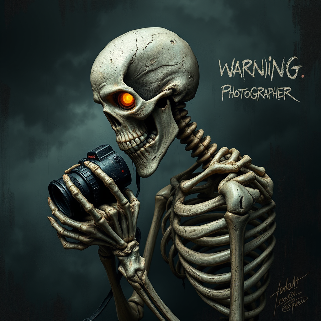 tarnished portrait of a grotesque skeleton photographer, glowing eyes on a side view against a dark dramatic stormy backdrop, warning text written in crooked morbid font, digitally created with splatter and drip painting technique, expressionist style with distorted proportions, mutated limbs, missing body parts, severely damaged skin, dry bones, deathly pale, overall ominous and unsettling atmosphere, noticeable jpeg artifacts, pixelation, distortion, museum quality, maybe, wood grain texture, eerie light, foreboding presence, heaps of torn metaphorical flesh, ghostly face, childlike scribbles, peculiar signature or autograph near the photographer's name