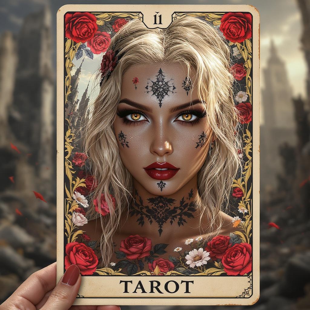 Tarot card, close-up face shot of an enchanting woman gazing directly at the viewer, surrounded by a tarot card border, adorned with numerous tattoos, including intricate rose designs, her blonde hair contrasting with her divine and model-like features. The backdrop reveals a post-apocalyptic cityscape, crafted in the style of The Last Of Us, captured in ultra-realistic detail. This masterpiece features the best quality imagery, presented as CG wallpaper with HDR and high-definition details. The scene is bathed in beautiful sunlight, emphasizing chiaroscuro effects. The composition blends anime style with breathtakingly vibrant and cinematic elements, where intricate detail and a cinematic aesthetic meet. Despite the detailed artistry, the image avoids low-resolution issues and common quality problems, maintaining its stunning visage and high quality.