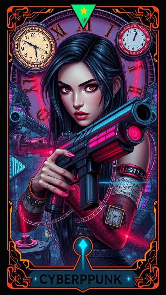 Tarot card design featuring a cyberpunk aesthetic, a detailed portrait of a woman wielding a futuristic gun, framed by intricate cyberpunk clocks and laser elements. She is surrounded by vibrant neon lights and advanced cybernetic equipment. The scene is set in a richly detailed science fiction, cyberpunk world, inspired by Cyberpunk 2077. The artwork is of masterpiece quality, high-definition, and features stunning chiaroscuro lighting akin to anime style. This key visual is incredibly detailed and cinematic, showcasing vibrant colors and breathtaking imagery that capture the essence of a futuristic cityscape.