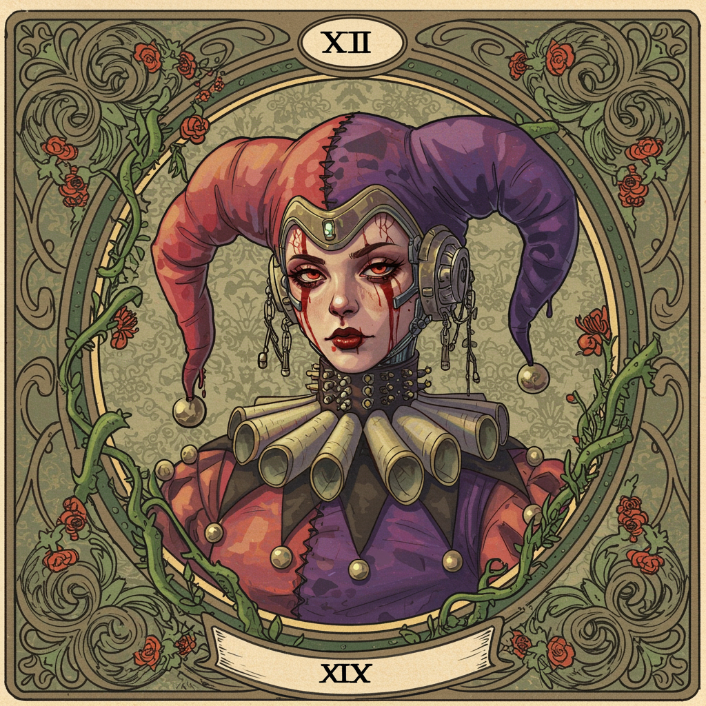 Tarot card featuring a cyberpunk jester with a futuristic headpiece, styled in Art Nouveau with meticulous detail. The composition includes a highly intricate, ornate frame surrounding the portrait. The jester, in vibrant cyberpunk attire, possesses black veins and oil drips, symbolizing the merging of nature and technology. Predatory plants and ivy wind around, enhancing the enigmatic allure. The girl's face conveys a somber expression with red splashes and undertones, set against a floral patterned background. This masterpiece is rendered in high definition, focusing on vivid details and embellishments, capturing the essence of contemporary digital art in 8K quality, illuminated with rim and artificial lighting to accentuate the ethereal atmosphere.
