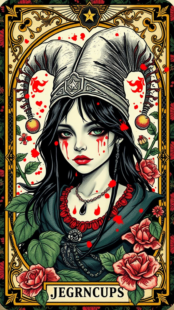 Tarot card featuring a cyberpunk portrait with a jester hat, surrounded by an intricate Art Nouveau-inspired frame. The card showcases a vibrant and detailed design, with embellishments and high-definition concept art elements. The central figure is a cyberpunk-themed girl with a melancholy expression, adorned with black veins dripping oil and framed by predatory plants and ivy. Red splashes and undertones provide a striking contrast to the gloomy atmosphere. The background features a floral pattern, captured in stunning detail. The illustration employs fine art techniques, with an 8K resolution enhanced by rim and artificial lighting to create a captivating scene.