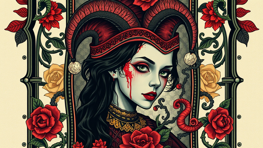 Tarot card featuring a cyberpunk-themed portrait of a head adorned with a jester hat, enclosed within an intricate, Art Nouveau-styled frame. The design boasts vibrant, high-definition details with embellishments that bring out the cyberpunk aesthetic, showcasing a combination of detailed digital and concept art. The card is characterized by its striking use of color and texture, featuring elements like black veins, oil-like drips, predatory plants entwined with ivy, and a girl's face exuding a sense of gloominess punctuated by red splashes and undertones. The background is an elegant floral pattern, harmonizing with the card's overall intricate design. The scene is illuminated by a mixture of rim and artificial lighting, enhancing the fine art quality. This tarot card is conceptualized in 8K resolution, ensuring every detail is meticulously rendered and focused, capturing the essence of a modern, dystopian mystique.