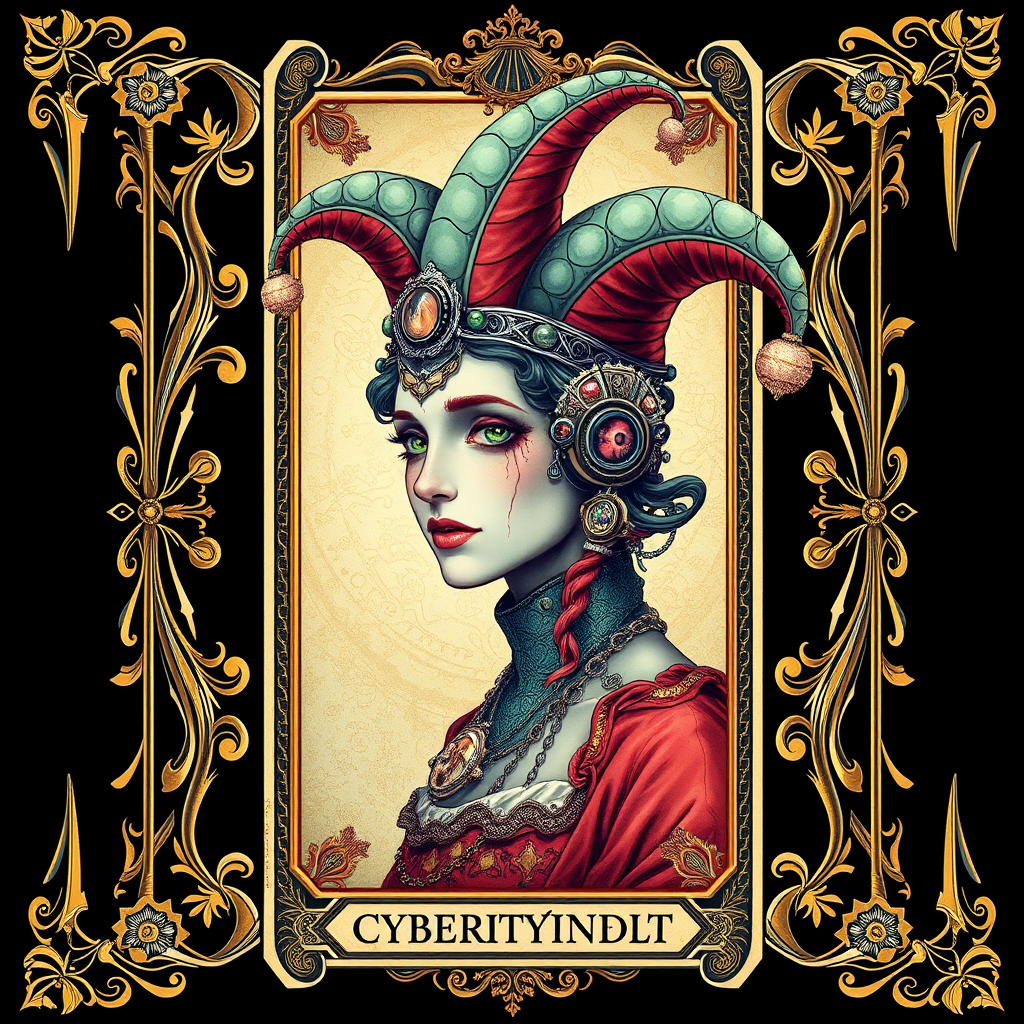 Tarot card featuring a finely detailed ornate border showcasing a cyberpunk-themed portrait with a whimsical jester hat; embodies the essence of cyberpunk fused with Art Nouveau style, showcasing an astonishing level of detail and embellishments; high definition digital concept art with vibrant colors and intricate designs throughout.
