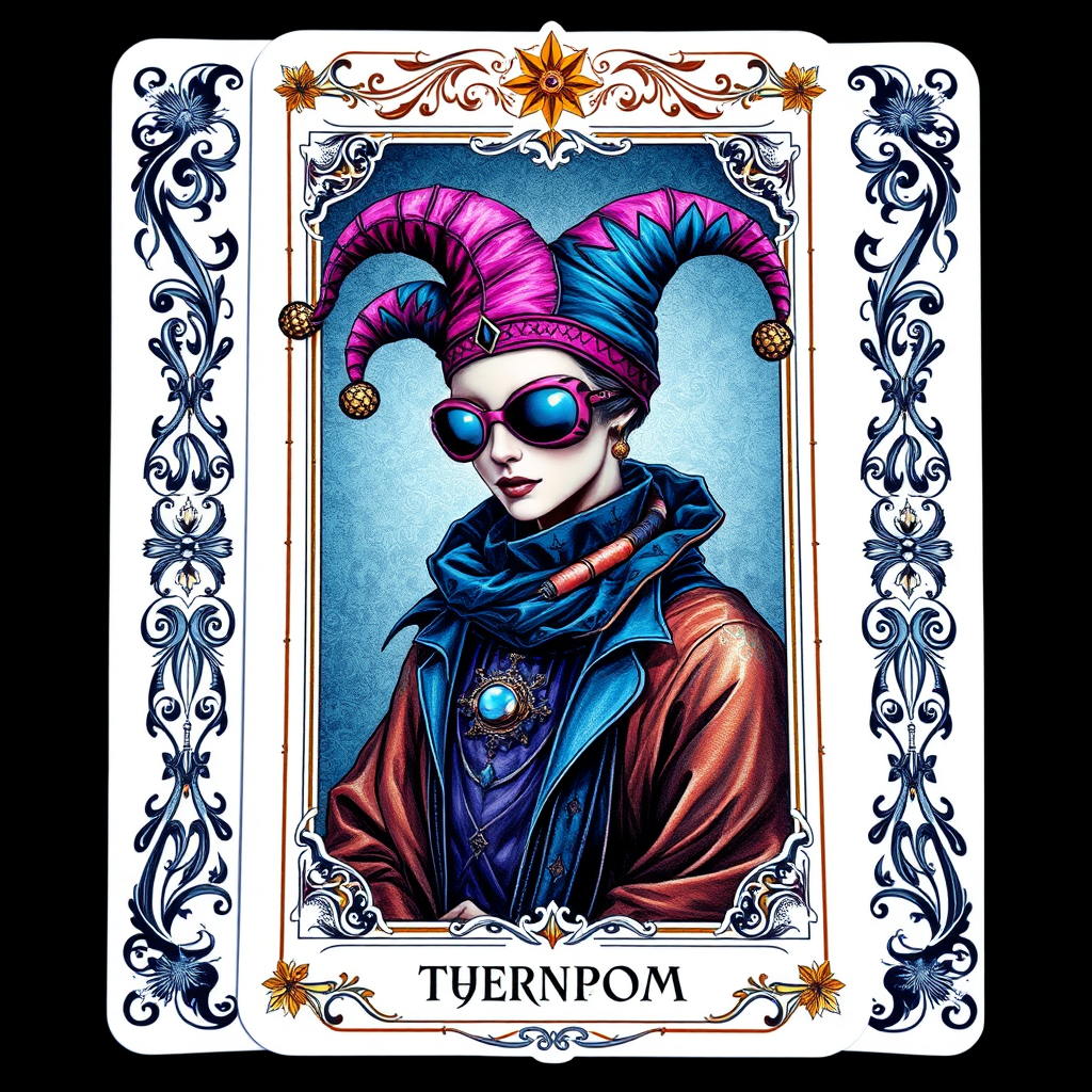 Tarot card featuring an elaborate ornate border | portrait of a cyberpunk figure adorned with a whimsical jester hat | cyberpunk theme | infused with Art Nouveau elegance | exquisitely detailed | rich in embellishments | high definition clarity | conceptual digital artwork | vivid and vibrant.