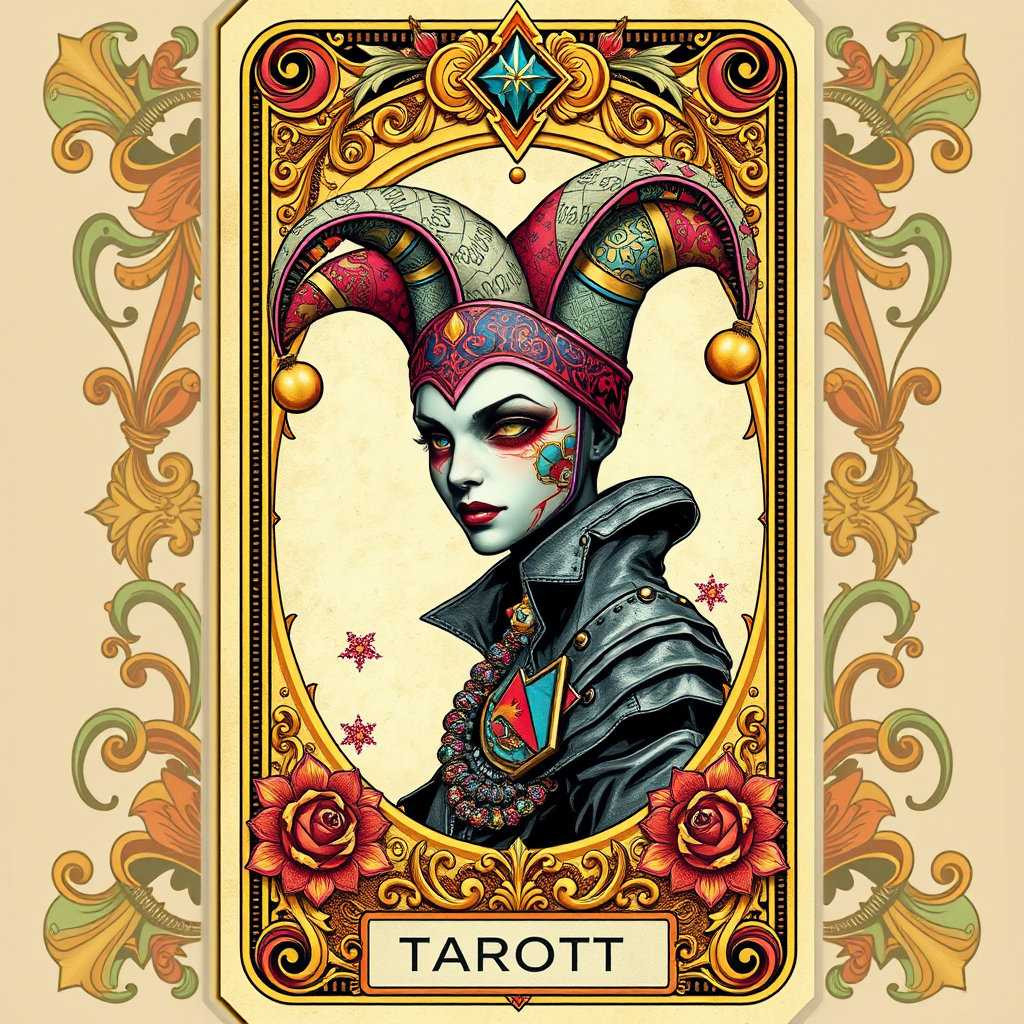 Tarot card featuring an intricately detailed border framing a portrait of a cyberpunk character adorned with a whimsical jester hat, rendered in a fusion of cyberpunk and Art Nouveau styles, showcasing extraordinary detail and artistic embellishments. This vibrant, high-definition digital art piece serves as concept art, highlighting the elaborate design and eye-catching ornamentation surrounding the striking figure.