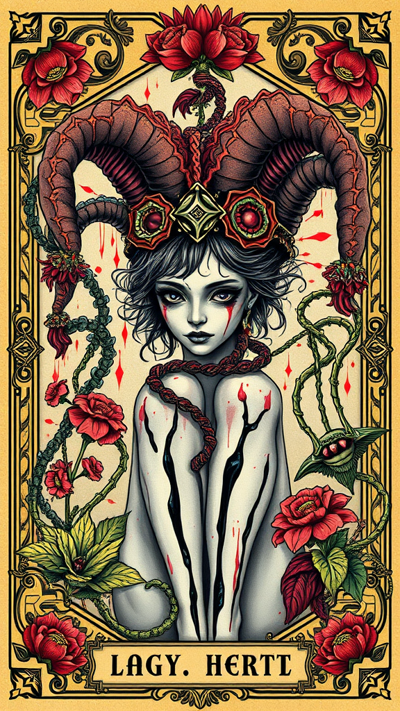 Tarot card featuring an intricately detailed frame encircling a portrait of a cyberpunk jester, their head adorned with an elaborate jester hat, exuding a vibrant Art Nouveau style. The composition is rendered with remarkable detail and embellishments, offering high-definition, concept art flair. It features vibrant colors with intricate linework, detailed 4K resolution, with the focus on the cyberpunk theme. The figure includes legs with black veins resembling dripping oil, surrounded by predatory plants and interwoven ivy. The girl's face presents a hauntingly gloomy expression, accentuated by red splashes and undertones. The background features an ornate floral pattern, merging illustration, painting, and fine art techniques. The overall aesthetic is heightened by subtle rim lighting and artificial lighting effects.