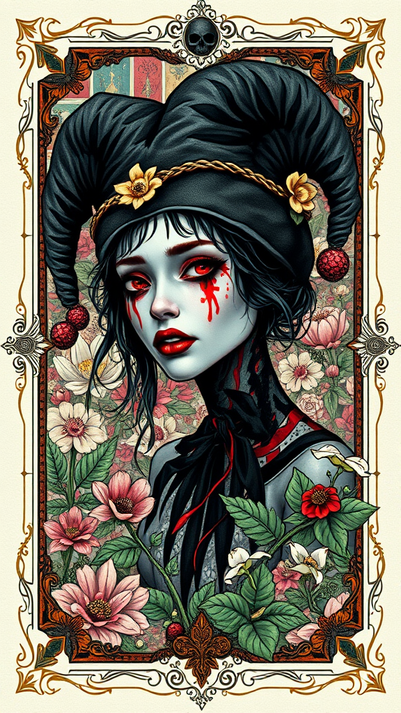 Tarot card featuring an intricately detailed frame surrounding the outside, depicting a portrait of a cyberpunk figure with a jester hat, designed in an Art Nouveau style. The image is highly detailed with vibrant embellishments, crafted in high definition concept art and digital art, showcasing 4K clarity. The cyberpunk jester is articulated with black veins and dripping oil, intertwined with predatory plants and ivy. The gloomy girl's face exhibits red splashes and undertones, set against a background floral pattern. This illustration captures the essence of painting and fine art, presented in 8K resolution with rim and artificial lighting for a dramatic effect.
