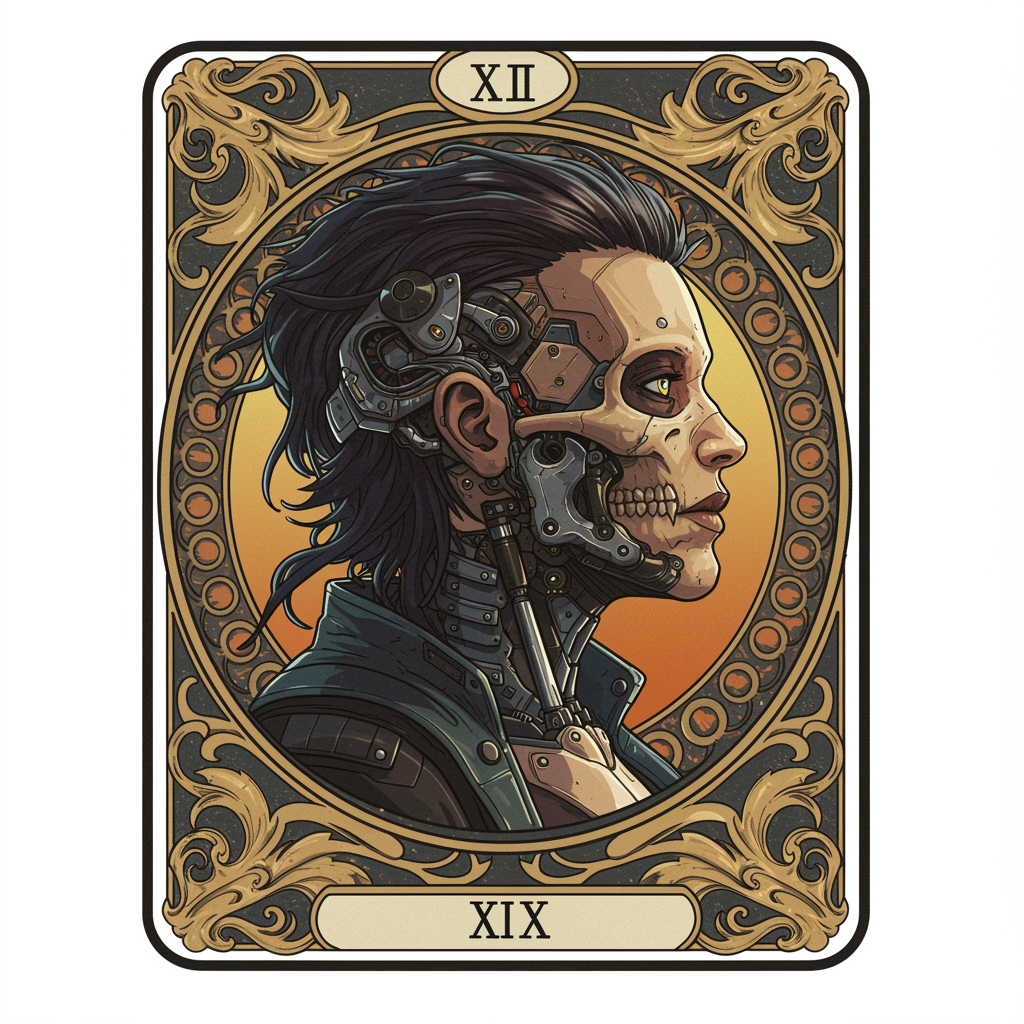 Tarot card featuring an intricately detailed frame encircling the design | side profile of a cyberpunk figure with a partially exposed cyborg skull | cyberpunk aesthetic blended with Art Nouveau style | highly detailed embellishments | high-definition concept art | digital illustration | rich, vibrant colors | enhanced with imaginative negative space elements.