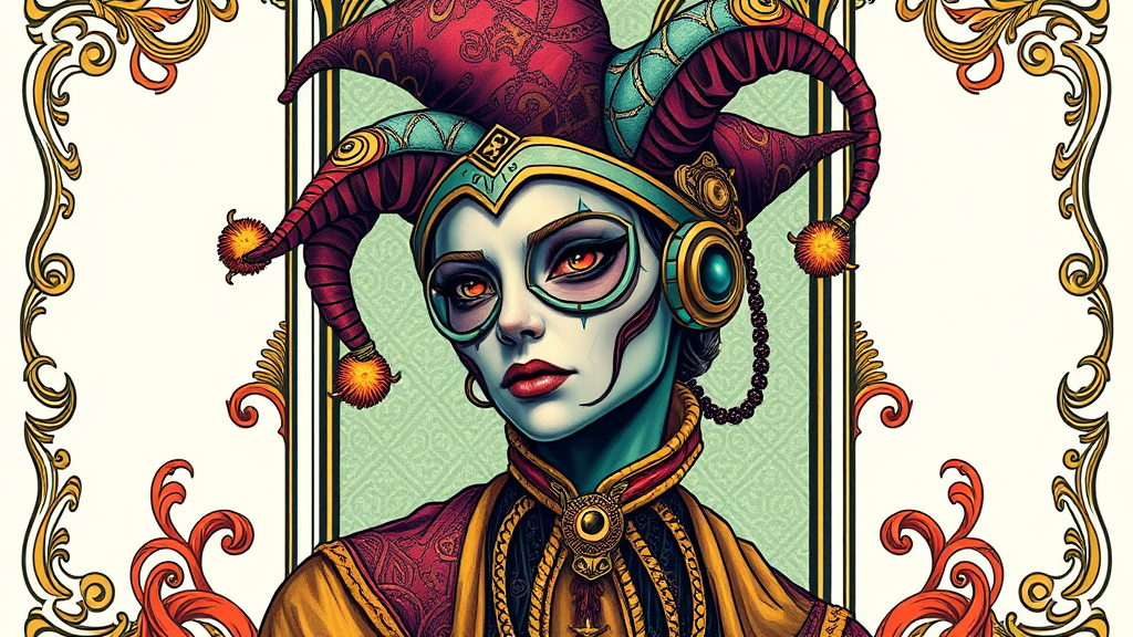 tarot card featuring an ornate detailed border | portrait of a cyberpunk character wearing a futuristic jester hat | neo-futuristic style | Art Nouveau influences | exceptionally detailed | ornamental enhancements | ultra-high definition | concept art | digital illustration | vivid and colorful palette