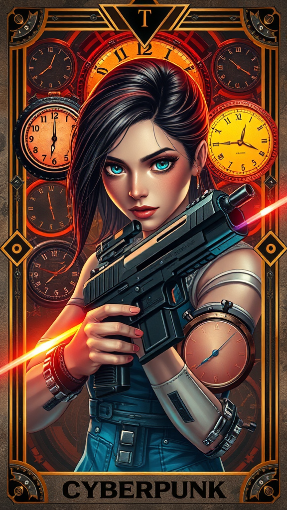 Tarot card frame composed of cyberpunk timepieces, a portrait of a woman wielding a gun, exquisitely detailed, surrounded by luminous clocks and lasers, featuring advanced cyberpunk technology, set in a futuristic sci-fi universe, inspired by the essence of Cyberpunk 2077. A visual masterpiece of high quality, combining CG elements for wallpaper resolution, HDR, and high definition, with extraordinary and intricate detail. Neon lights and chiaroscuro in an anime style, delivering key visual aspects with a cinematic perspective. Emphasizes vibrant colors and breathtaking imagery, maintaining sharp clarity and coherent features. Avoids distortions, retains defined details, and presents an engaging, captivating scene.