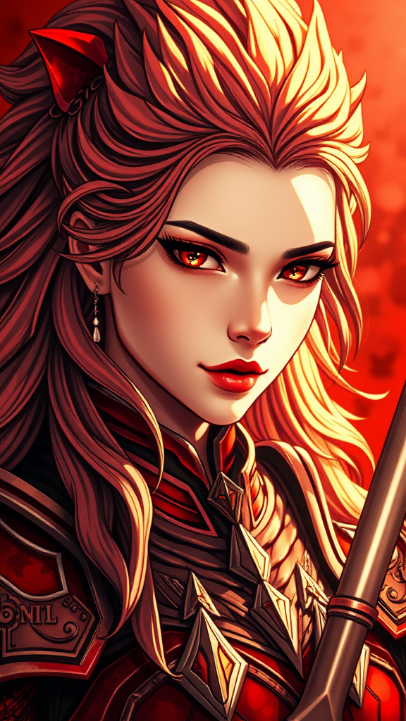 Tarot card, high quality portrait of a stunning female warrior, with a captivating face, in radiant red armor and a mane resembling a lion's, intricate and elegant, with highly detailed dynamic lighting, concept art style. The portrait features a beautifully detailed and expressive face, illustration at 8k quality, a true masterpiece of best quality CG, suitable for wallpaper, HDR, high-definition, extremely detailed. The image includes beautiful sunlight, chiaroscuro effects, anime style, and serves as a key visual. It boasts breathtaking and vibrant cinematic appeal, with an intricately detailed and dynamic background in red hues. The portrait style ensures a focused and alluring depiction, emphasizing the warrior's strength and elegance without compromising on visual clarity or quality.