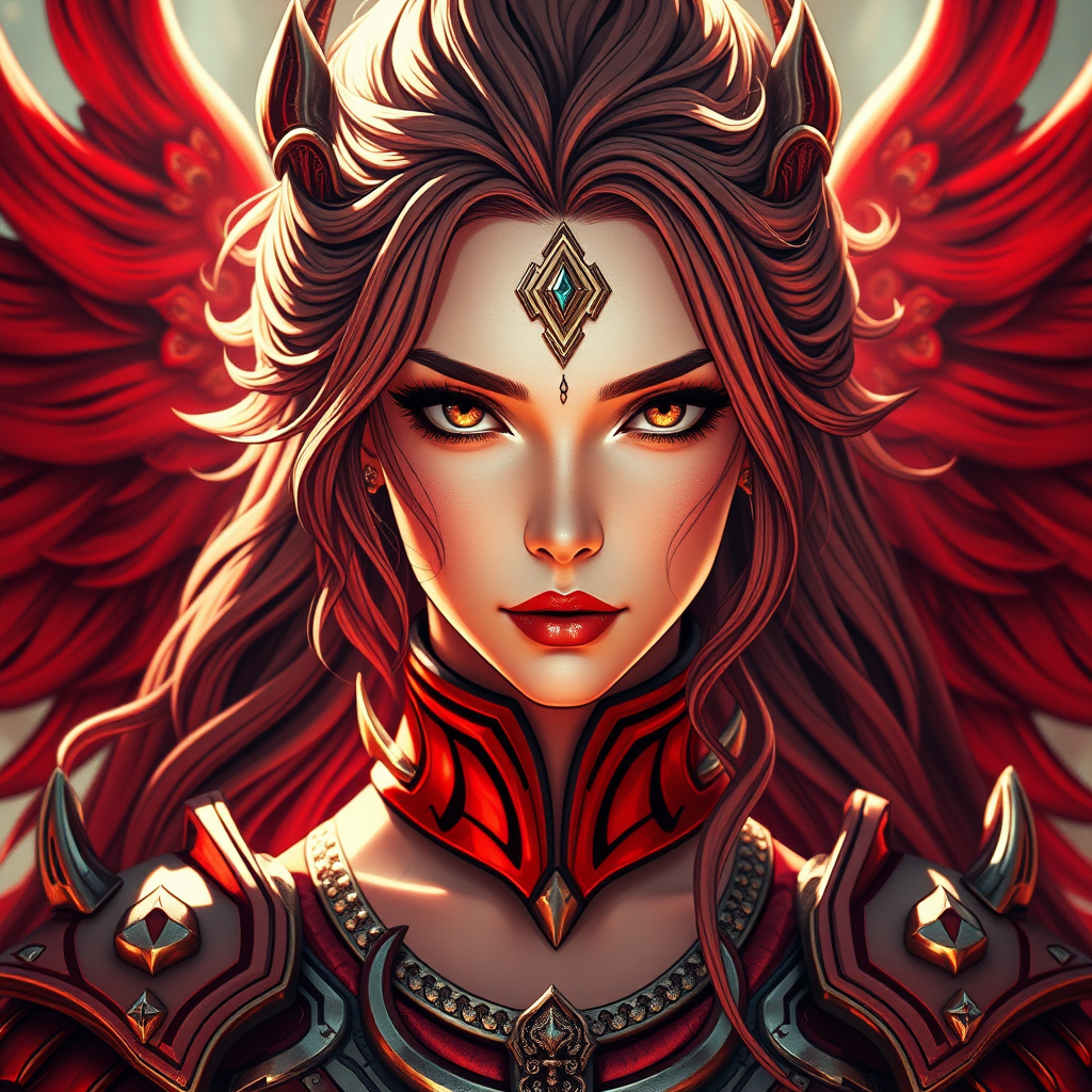 Tarot card, high quality portrait of a stunning female warrior, female portrait, clad in elegant red armor, resembling a lion's mane, intricate and elegant design, highly detailed, dynamic lighting, concept art, striking and detailed female face, illustration, 8k resolution, masterpiece with the best quality, CG artwork suitable for wallpaper, HDR, high-definition precision, extremely detailed depiction, bathed in beautiful sunlight, chiaroscuro effect, anime style, key visual, breathtaking and vibrant with cinematic appeal, a detailed background, prominent red hues, masterful use of color avoidance of low-quality aspects, ensuring clarity and vividness, captivating eyes, and lips that enhance the beauty of the portrait, coherent and symmetrical features for an inspiring and memorable artistic vision.