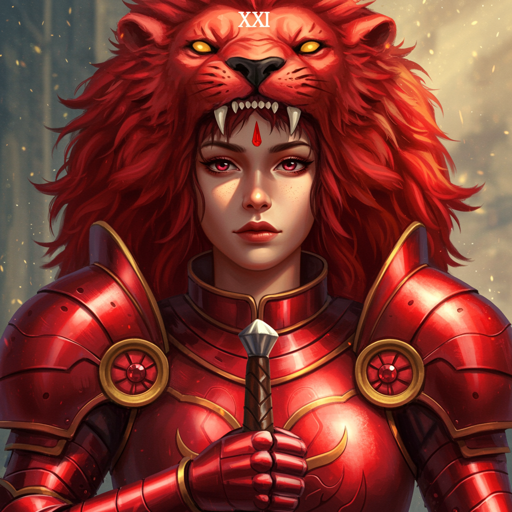 Tarot card, high-quality portrait of a stunning female warrior, female portrait in gleaming crimson armor, adorned with a majestic red lion mane, elegant and intricate design, dynamic and cinematic lighting, concept art with a beautifully detailed face, 8k resolution, masterpiece, CG illustration, wallpaper quality, HDR, exceptionally detailed, captivating sunlight creating a chiaroscuro effect, anime style, key visual with intricate detail, breathtaking and vibrant, beautifully composed background, rich red hue, high-definition clarity, painted in vivid and harmonious colors, showcasing a richly textured and expressive face, displaying a radiant and unique personality.