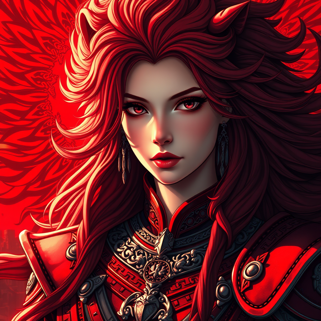 Tarot card-inspired high-quality portrait of a stunning female warrior, featuring a beautiful female face in intricate and elegant red armor complemented by a red lion mane. This illustration exudes vibrant dynamic lighting and is executed in a concept art style, showcasing a masterpiece in an 8k resolution. The scene bathes in beautiful sunlight, incorporating chiaroscuro effects reminiscent of anime style. The portrait captures breathtaking cinematic elements with intricate detail, set against a richly detailed background that resonates with a red hue. This high-definition, CG wallpaper boasts the best quality, showcasing a captivating and detailed portrayal of strength and beauty in vibrant colors.
