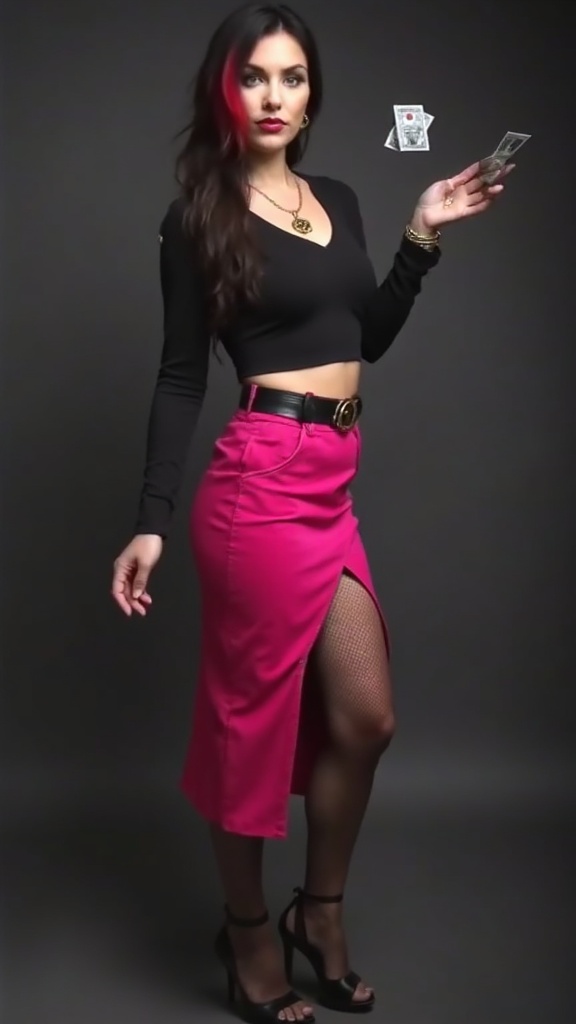 Tarot Card reader, Irish Gypsy, psychic. Model. Feminine,Caucasian woman of Irish heritage. Tall, strong, fit, lithe, slender but shapely. Sensuous. Long black layered hair, side parted with loose curls cascading over one eye, with one long red streak on that side. Thin gold circlet band around her forehead. Pretty face with green eyes {{mint green eyes}} and long lashes, giving that knowing look. Glossy ruby lips. Fair skinned. Delicate gold necklace with Celtic amulet around her slender neck, small golden hoop earrings in her ears. Black spandex crop top with scooped out neck and long sleeves, a hot pink mini-vest over top of it. Gold bangle bracelets on her wrists. Black leather designer belt with a golden ring buckle around her waist. Form fitting and higher on one side knee length skirt, hot pink and slit down one side. Black fishnet stockings on her shapely legs. High heeled black stiletto shoes, with straps around her ankles. Full body pose, Tarot cards flying through the air, signifying her psychic powers.