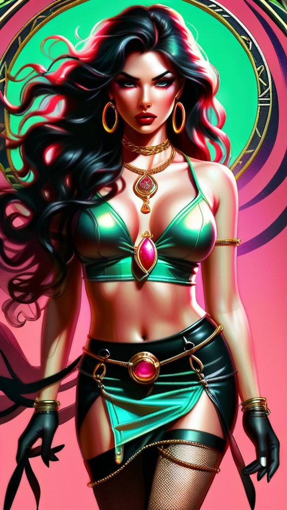 Tarot Card reader, Irish Gypsy, psychic. Model. Feminine,Caucasian woman of Irish heritage. Tall, strong, fit, lithe, slender but shapely. Sensuous. Long black layered hair, side parted with loose curls cascading over one eye, with one long red streak on that side. Thin gold circlet band around her forehead. Pretty face with green eyes {{mint green eyes}} and long lashes, giving that knowing look. Glossy ruby lips. Fair skinned. Delicate gold necklace with Celtic amulet around her slender neck, small golden hoop earrings in her ears. Black spandex crop top with scooped out neck and long sleeves, a hot pink mini-vest over top of it. Gold bangle bracelets on her wrists. Black leather designer belt with a golden ring buckle around her waist. Form fitting and higher on one side knee length skirt, hot pink and slit down one side. Black fishnet stockings on her shapely legs. High heeled black stiletto shoes, with straps around her ankles. Full body pose, Tarot cards flying through the air, signifying her psychic powers.