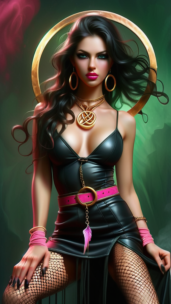 Tarot Card reader, Irish Gypsy, psychic. Model. Feminine,Caucasian woman of Irish heritage. Tall, strong, fit, lithe, slender but shapely. Sensuous. Long black layered hair, side parted with loose curls cascading over one eye, with one long red streak on that side. Thin gold circlet band around her forehead. Pretty face with green eyes {{mint green eyes}} and long lashes, giving that knowing look. Glossy ruby lips. Fair skinned. Delicate gold necklace with Celtic amulet around her slender neck, small golden hoop earrings in her ears. Black spandex crop top with scooped out neck and long sleeves, a hot pink mini-vest over top of it. Gold bangle bracelets on her wrists. Black leather designer belt with a golden ring buckle around her waist. Form fitting and higher on one side knee length skirt, hot pink and slit down one side. Black fishnet stockings on her shapely legs. High heeled black stiletto shoes, with straps around her ankles. Full body pose, Tarot cards flying through the air, signifying her psychic powers.