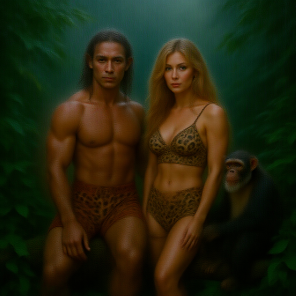 Tarzan and Jane are perched confidently on a wide tree branch in a lush tropical forest, gazing directly at the camera. Both are clad in intricately patterned leopard skin swimwear. Jane, with her flowing golden hair, stands slightly closer to the camera. A curious chimpanzee sits beside them, adding a playful touch to the scene. The forest around them is vibrant and alive, the leaves of the trees glistening as a heavy rain falls, creating a dramatic and immersive atmosphere.