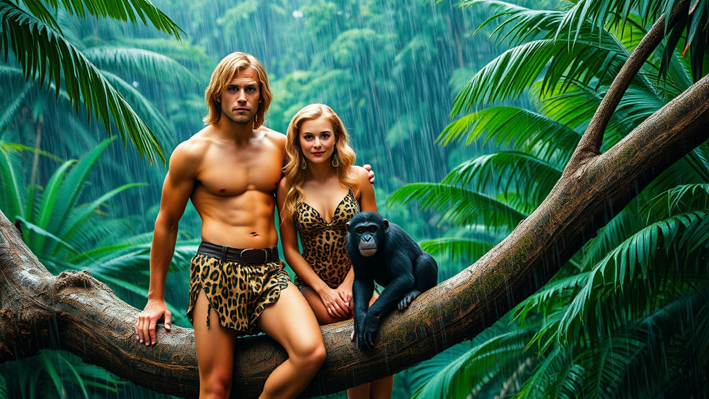 Tarzan and Jane are poised on a sturdy tree branch in a lush tropical forest, their eyes meeting yours with a sense of adventurous curiosity. Jane's golden blonde hair cascades around her shoulders, and both are clad in striking leopard-patterned swimwear, perfectly blending with their wild surroundings. A playful chimpanzee sits nearby, adding a touch of whimsy to the scene. The forest is alive with the sound of heavy rain, creating a dynamic and immersive atmosphere as droplets cascade around them. The vibrant greenery shimmers with moisture, enhancing the richness of this vivid, realistic portrayal.