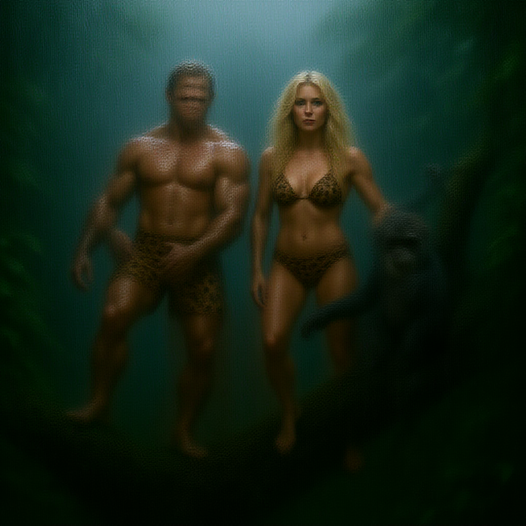 Tarzan and Jane, both clad in leopard skin swimwear, balance on a sturdy tree branch in a lush tropical rainforest. Jane, with her flowing blonde hair, stands confidently beside Tarzan. A curious chimpanzee perches next to them, glancing at the viewer. The entire scene is enveloped in a torrential downpour, with raindrops cascading around them, creating a misty, mystical atmosphere. The dense foliage provides a vibrant, green backdrop, enhancing the adventurous and wild spirit of the moment.