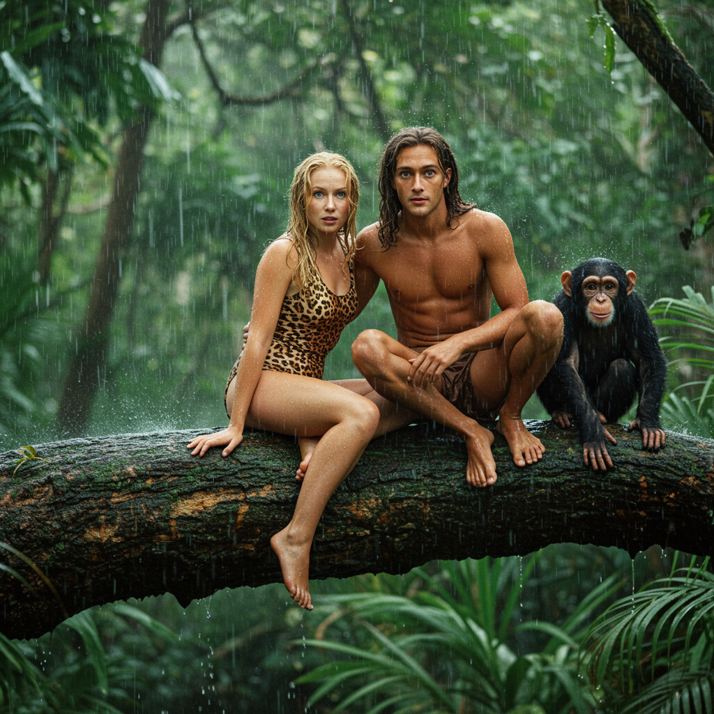 Tarzan and Jane perched on a sturdy tree branch in a lush tropical forest, their eyes meeting the viewer's gaze. Both clad in leopard print swimwear, Jane's long, blonde hair is slick from the heavy rain surrounding them. Beside them, a curious chimpanzee clings to the branch. The scene is alive with the sound of the rain tapping against the dense canopy, creating a vibrant contrast with the vivid greenery of the jungle, while drops of water glisten on their skin, capturing a moment of wild harmony.