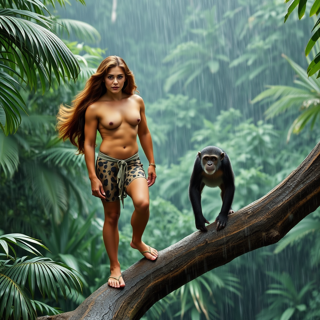Tarzan and Jane stand poised on a sturdy tree branch in a lush tropical forest, gazing directly at the viewer. Clad in striking leopard-patterned swimwear, Jane's flowing chestnut hair contrasts with the verdant surroundings. A playful chimp perches beside them, its fur glistening with rainwater. The scene is captured as a realistic photograph, with heavy rain cascading down, adding a dynamic sense of movement and drama to the vibrant tableau.