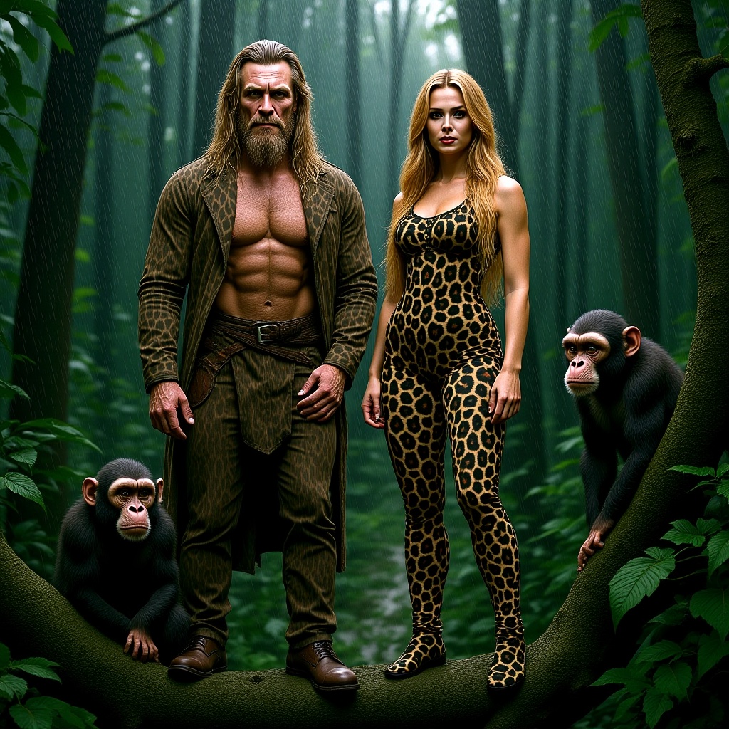 Tarzan and Jane stand confidently on a sturdy tree branch in the heart of a lush tropical forest, both draped in leopard skin attire. Jane's long, golden hair cascades down her shoulders, contrasting with the dark green of the jungle. A curious chimpanzee perches beside them, its expressive eyes reflecting the intrigue of the scene. Raindrops fall heavily around them, creating a misty veil as they gaze intently at the viewer, their expressions undeterred by the storm.