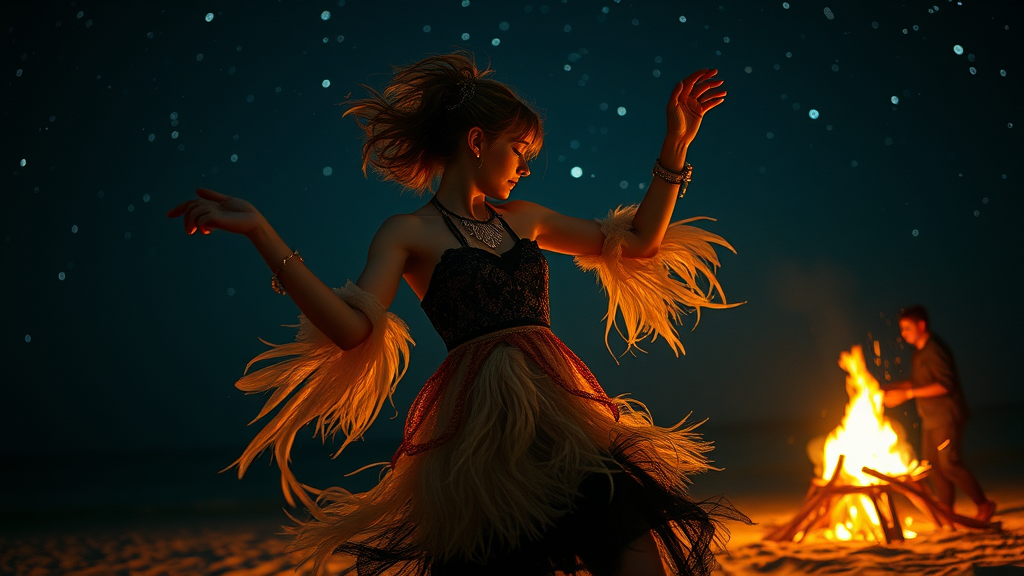 Tavi Gevinson dances under the night sky, adorned with feathers and intricate jewelry, her figure illuminated by the flickering glow of a beach fire. The scene is reminiscent of the fine artistry of Magali Villeneuve, Eve Ventrue, and Anna Dittmann, capturing a realistic depiction of light with a touch of luminous pointillism. Her movements are fluid and ethereal, as if choreographed by the stars themselves, reminiscent of the creative styles of The Stars Art Group and Sultan Mohammed. Her silhouette is partially enveloped in shadows, with hints of charred texture adding an enigmatic allure to the scene, creating a mesmerizing blend of realism and fantasy.