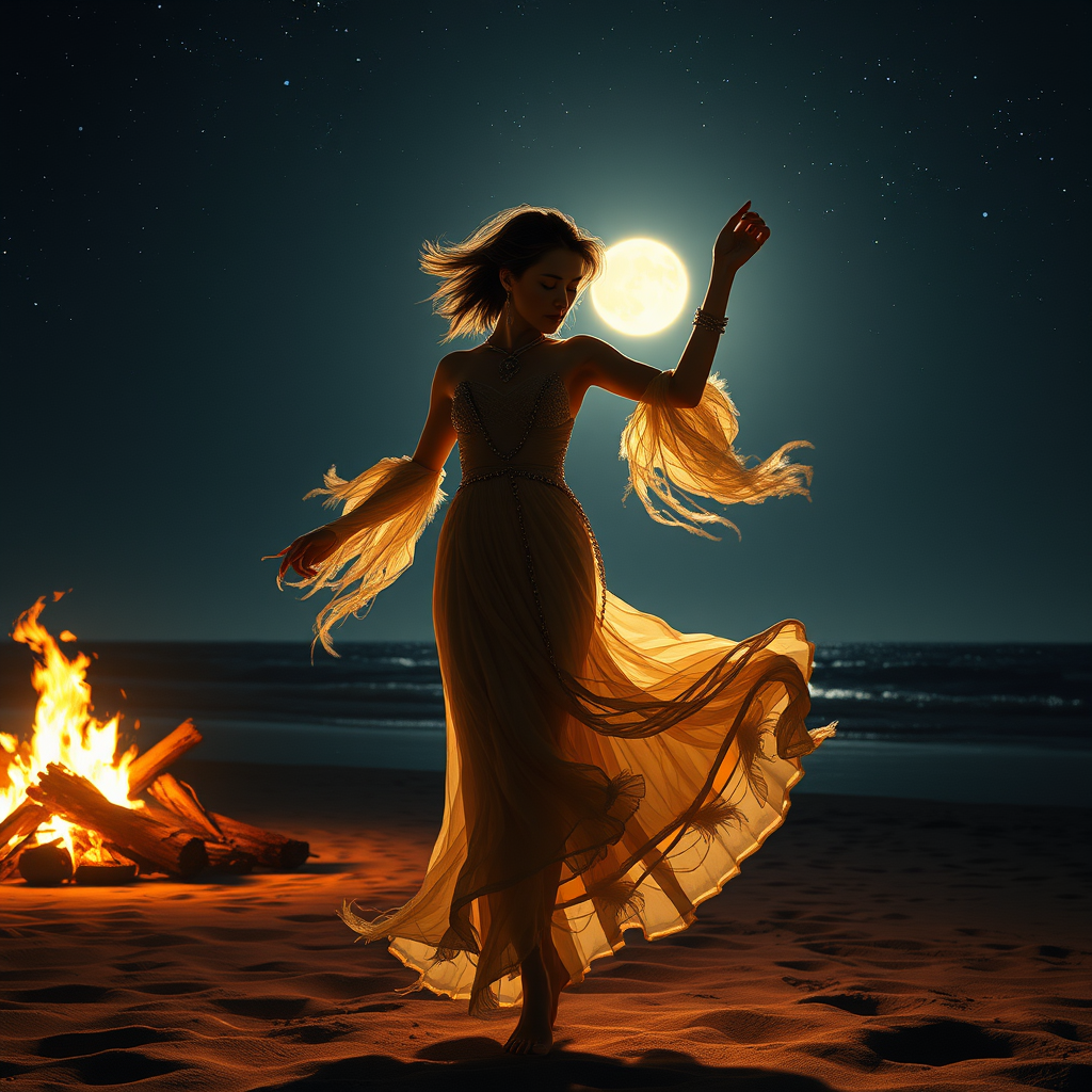 Tavi Gevinson elegantly dances on the moonlit beach, her silhouette outlined by the flickering firelight. Feathers and intricate jewelry adorn her, catching the light as they move fluidly with her graceful movements. The scene is reminiscent of the enchanting works of Magali Villeneuve, Eve Ventrue, and Anna Dittmann, with a realistic depiction of light playing across her form. Luminous pointillism highlights her features, while Daz3D adds a depth of realism. The atmosphere is imbued with the mystical aura of the Stars Art Group and the historic elegance of Sultan Mohammed's era, with hints of charred textures where the fire casts its shadows. The night sky sparkles above, a tapestry of stars adding to the magical ambiance.